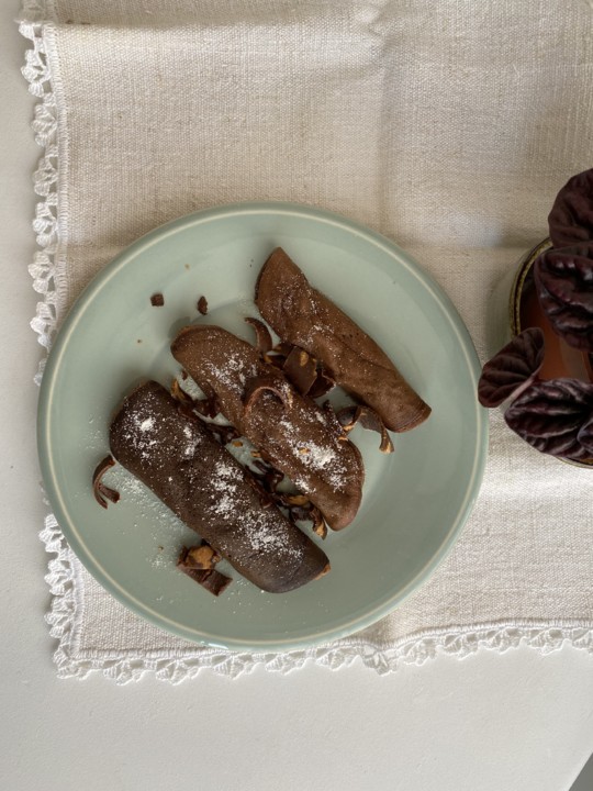 Crepes de cacau com raspas de chocolate